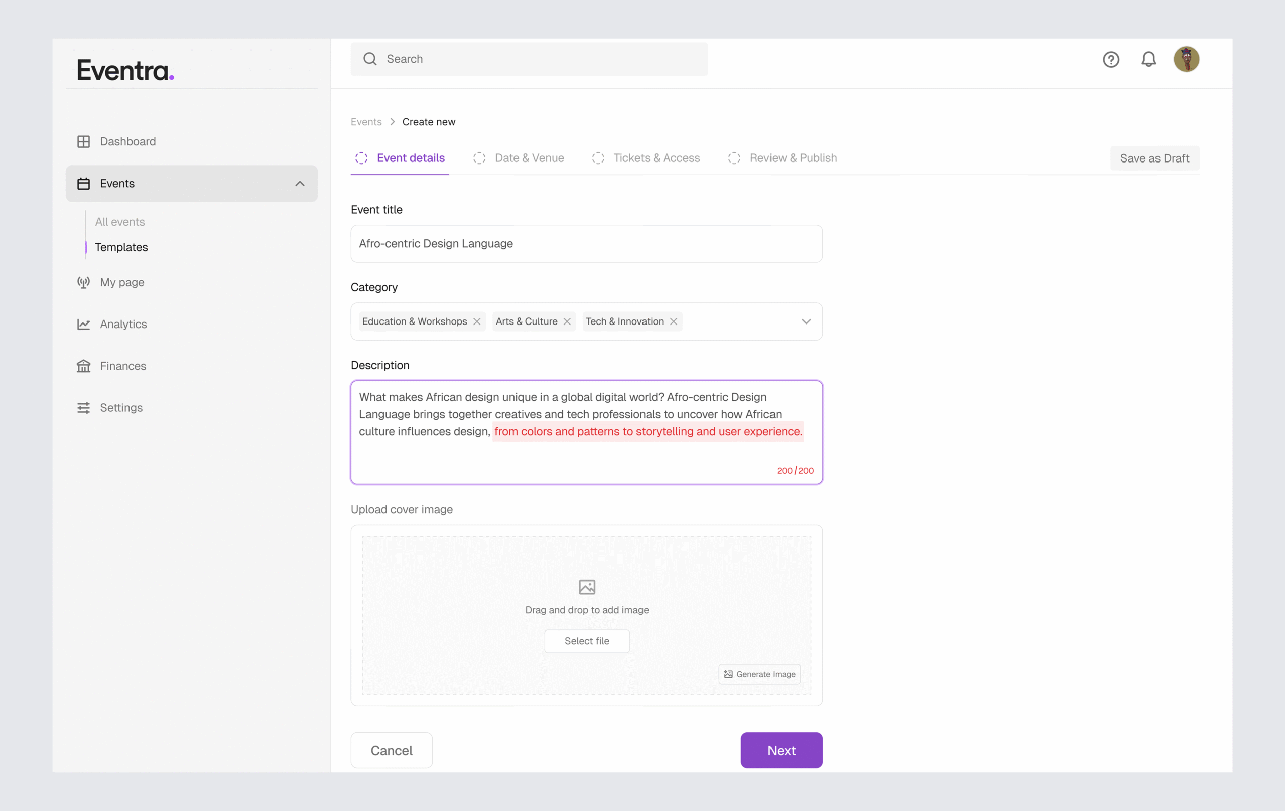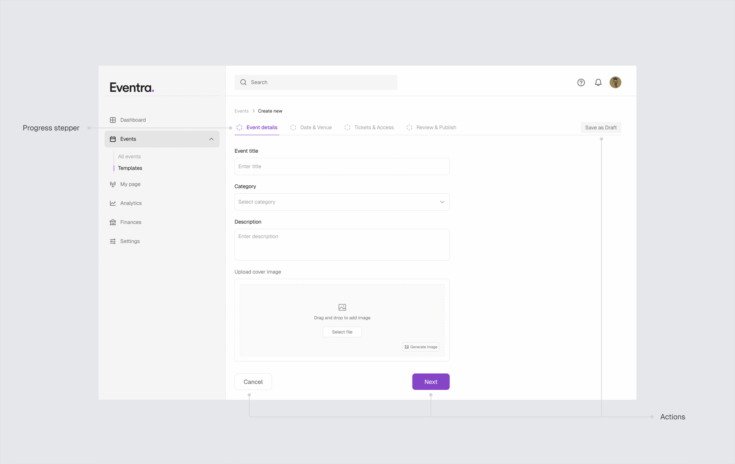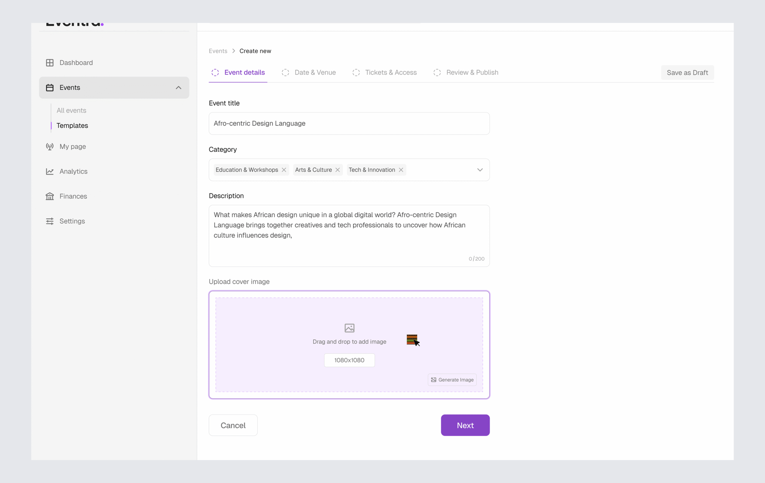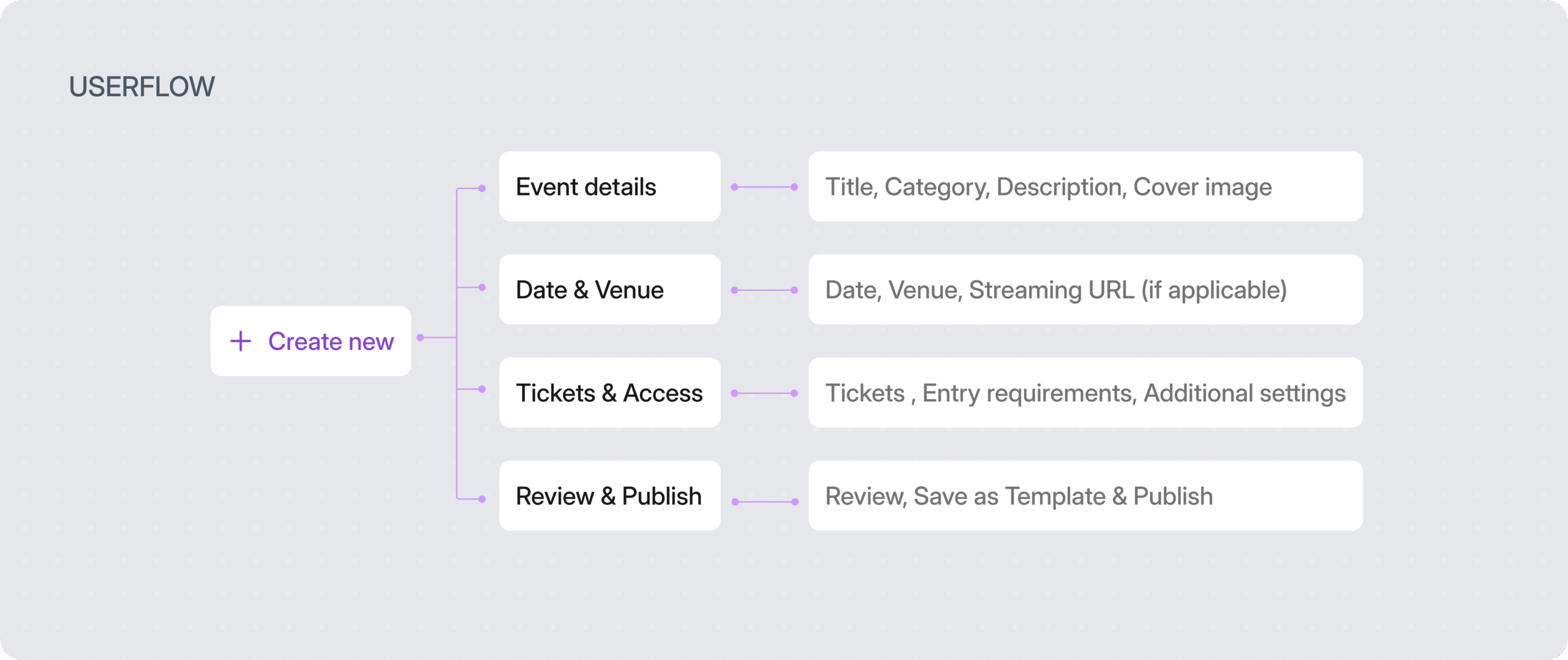 To fix this, I streamlined the process into four clear steps: Event Details, Date & Venue, Tickets & Access, and Review & Publish. These steps focus only on the most essential inputs, helping users move faster while maintaining clarity and control.